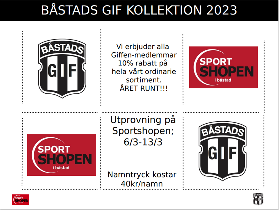Nu är det dags för en ny beställnings & utprovningsperiod av Giffenkläder. Denna gång är det den 6-13 mars. Som vanligt erbjuds fina och bra träningskläder och ledarkläder för alla våra sporter (både inomhus och utomhus). Så bege er till Sportshopen i Båstad för att prova och beställa! Alla Giffenmedlemmar har alltid 10% på hela sortimentet på Sportshopen, perfekt när man behöver nya löpar eller fotbollsskor! Giffenmössor och halsdukar kan man köpa i klubbstugan (hos Anette) i loppisen på lördagarna kl. 10.00-13.00, samt i samband med hemmamatcher i kiosken i idrottshallen. Varmt välkomna!