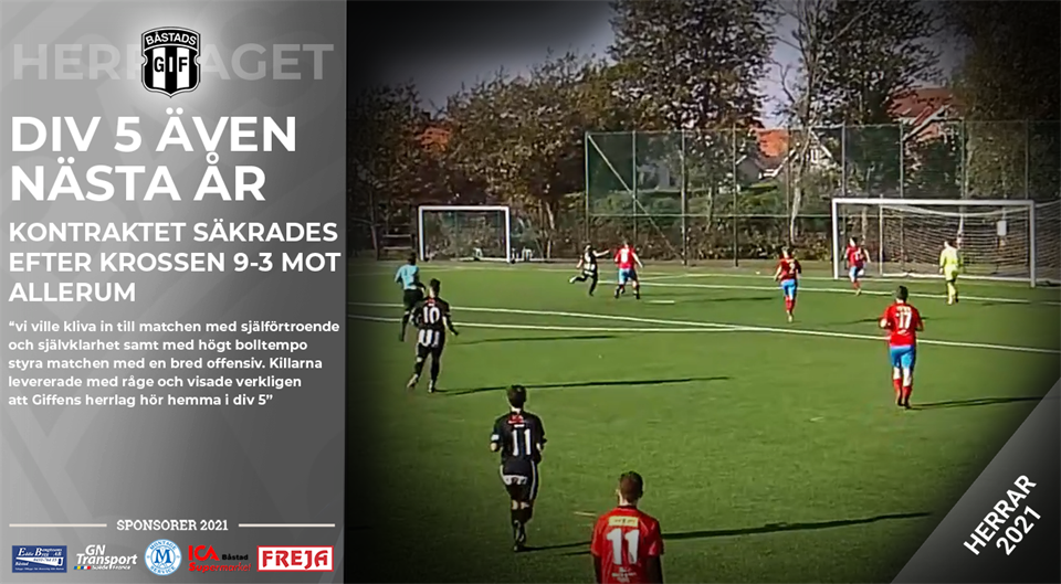 Båstads GIFs herrlag spelar div 5 fotboll även nästa år. Efter en imponerande laginsats krossade herrlaget Allerums GIF med hela 9-3, efter mål av Anton Isberg (3), Leutrim Sula (2), Alfred Kander (2), Gustav Malmqvist och Egon Sterner. Trots att Allerum gjorde sitt bästa för att försvara sig och backade hem för att täppa till ytorna så var laget emellanåt nästan genant underlägsna ett piggt och konsekvent spelande Giffen. - För oss handlade dagen om att visa självförtroende och självklarhet i vårt spel. Högt bolltempo och offensiva löpningar i 90 minuter. Killarna levererar och jag kan bara summera dagen med "mission accomplished". Det är svårt att möta ett lag som hela tiden försvarar sig med tio man. Trots det gör vi nio mål. Det visar på en spelidé och ett kollektiv som är kreativt och som förtjänar beröm, kommenterade Båstads tränare Mats-Ola Borglund. Herrlaget visade prov på ett stort bollinnehav och styrde matchen i 90 minuter. Extra roligt idag var att se hela laget anfalla förståndigt och med fart. - Vi pratade inför matchen om vikten av att få Allerum att springa sig trötta för att skapa ytor till vårt kantspel, och det fungerade precis så bra som vi hade tänkt oss. Gustav Malmqvist har nog sällan löpt så mycket som han gjorde idag från sin ytterbacksplats, och hans framspelning till Anton Isbergs 2-0 mål var enligt mig dagens behållning. Nästa helg kommer serieledarna Hyllinge GIF på besök för att eventuellt spela hem seriesegern i div 5 NV skåne 2021. - Hyllinge är bra och leder serien fullt rättvist. Dock har vi revansch att erfordra efter en svag insats på bortaplan, så vi kommer att gå för seger i den matchen. Vi vill inte ha två förluster mot något lag under säsongen så vi kommer att sälja oss dyrt, avslutar tränare Borglund.
