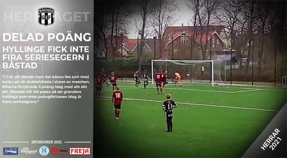 Hyllinge GIF hade på lördagen möjlighet att säkra seriesegern i serien genom vinst mot Båstad på Örebäcksvallens konstgräsplan. Hemmalaget hade revansch att fordra efter en svag insats lagen emellan under vårsäsongens match i Hyllinge. Matchen började i ett högt tempo och Båstad började piggt med hög press på bollhållaren i Hyllinge. Man kunde rätt snabbt se att motståndarna inte var vana vid att hela tiden hamna i tidsbrist så de första 20 minuterna blev ett ställningskrig kring vilket lag som skulle ta kommandot i matchen. I matchens 21 minut ställde hemmalaget om snabbt och Micke Bohlin fick ett friläge lätt pressad av en av Hyllinges mittbackar och skottet smet strax utanför målvaktens högra stolpe. Egon Sterner skojade friskt med sin bevakning och var ett ständigt orosmoment på sin högerkant. Efter ytterligare några minuter hittade Gustav Malmqvist fram till Alfred Kander på högerkanten, som tog sin in i straffområdet och fälldes. Domaren pekade på straffpunkten, och Alfred själv satte 1-0 till hemmalaget fullt rättvist. Resten av halvleken var jämn, men hemmalaget kunde gå till vila med 1-0 i bagaget. Andra halvlek fortsatte med samma höga tempo och samma höga press från hemmalaget, som var fast beslutna att inte låta Hyllinge fira seriesegern efter matchen. Efter en något förlupen boll kunde dock Hyllinge till slut reducera i matchens 84,e minut efter det att Gustav Malmqvist olyckligt halkade vid en brytning och 1-1 var ett faktum, ett resultat som stod sig matchen ut. - Två väldigt jämna lag i en mycket bra div V match. Vi var fast beslutna att inte låta Hyllinge komma till Båstad och fira serieseger utan att först gjort en ordentlig insats. Vi lyckas med vår matchplan, Hyllinge fick ingen tid att sikta långbollar bakom vår backlinje. När vi sedan lyckades spela igenom deras två höga lagdelar kom vi ofta till avslut genom ett effektivt kantspel. 1-1 är väl rättvist men det känns lite surt med tanke på vår dubbelchans i slutet av matchen. Killarna förtjänade 3 poäng idag med allt sitt slit kommenterade Båstads tränare Masse Borglund efter matchen. För Båstads GIF var resultatet ett viktigt kvitto på att man kan störa och utmana vilket lag som helst i den här serien, och Hyllinge skall vara nöjda med att åka hem med en poäng i bagaget. Den poängen skulle samma eftermiddag visa sig räcka till serieseger efter Ekets förlust hemma mot Munka-Ljungby med 0-1. Båstads GIF vill därmed gratulera Hyllinge GIF till en välförtjänt serieseger och uppflyttning till div IV 2022. Nu återstår bara två matcher av 2021, med ett besök av Ödåkra på lördag för att sedan göra avslut för året borta mot Förslövs IF kommande söndag. Vi hälsar våra supportrar varmt välkomna till hemmaavslutningen på konstgräset på lördag.