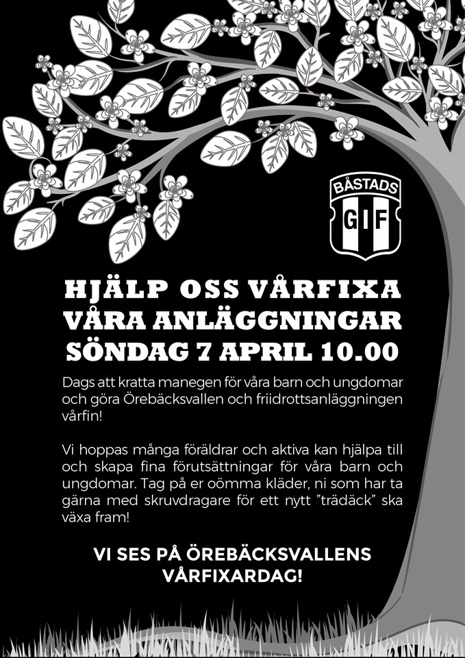 Hej, Varmt välkomna ALLA till vårfixardag söndagen den 7 april kl. 10.00, samling på Örebäcksvallen, vi kommer göra både Örebäcksvallen och Friidrottsanläggningen vårfina! Förutom att göra anläggningarna vårfina ska vi bygga ett trädäck framför längan, så ni som har skruvdragare toppen ifall ni kan ta med det! Tänk på att denna dag är riktigt viktig för vår förening och för att våra barn och ungdomar ska ha fina träningsanläggningar! Så vi ser gärna att alla aktiva och minst en förälder kommer och hjälper till under några timmar denna dag.