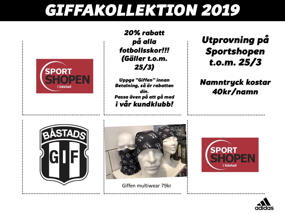 Hej, Från och med nu och fram till den 25 mars så går det bra att prova ut och beställa Giffen kläder på Sportshopen. Sportshopen erbjuder även alla Båstads GIF medlemmar 20% rabatt på fotbollsskor fram till den 25/3!