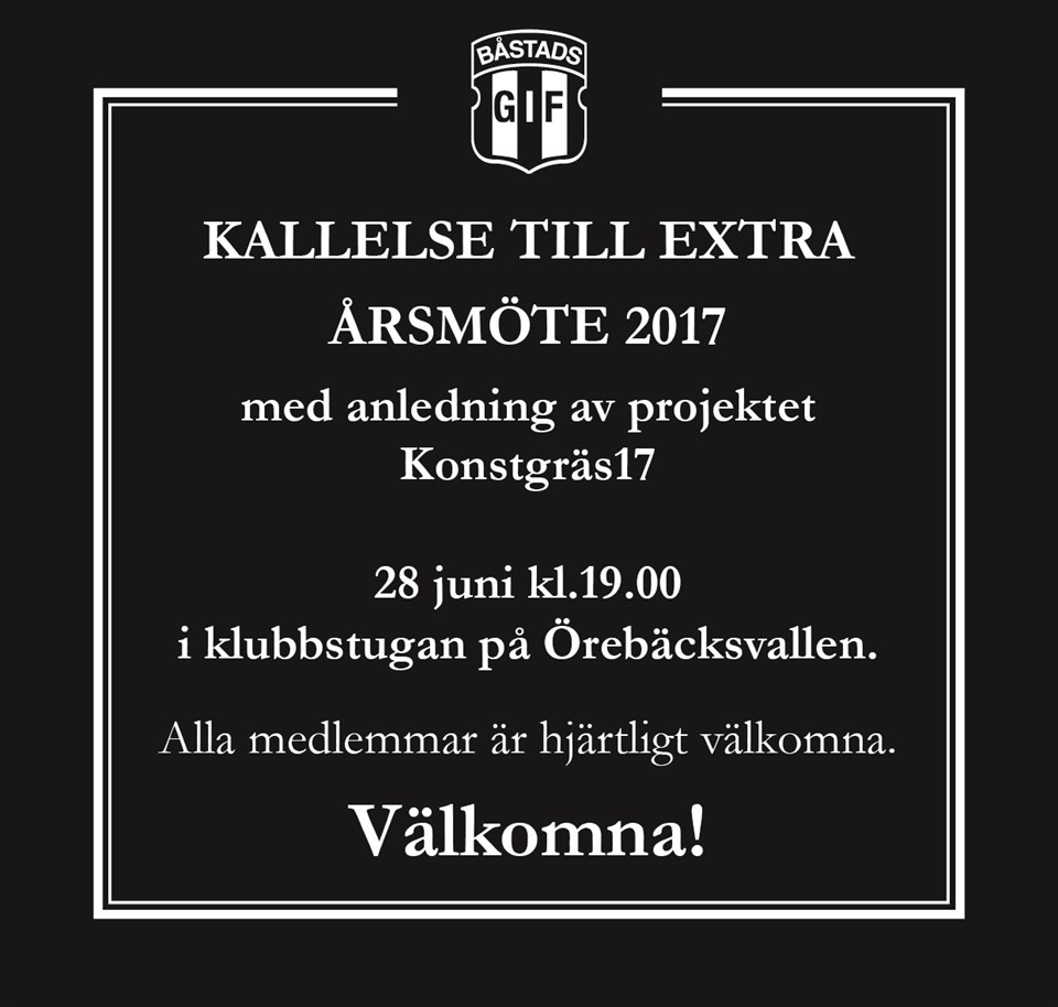 Men anledning av projektet konstgräs 2017, bjuder vi in alla medlemmar till ett extra årsmöte den 28 juni kl. 19.00 i klubbstugen på Örebäcksvallen. Alla medlemmar hjärtligt välkomna! //Styrelsen