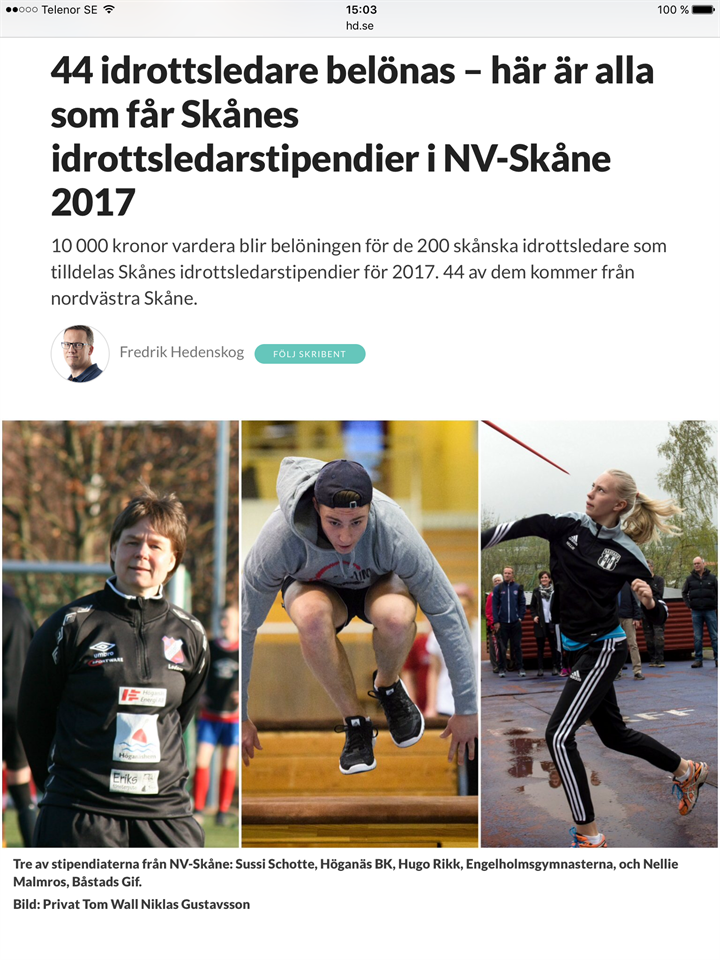 Vilka duktiga ungdomsledare vi har i BGIF, Vi fick igår den glada nyheten att Båstads GIF har två ungdomsledare som tilldelas Sparbanksstiftelserna i Skåne och Skåneidrottens idrottsledarstipendium 2017. Nellie Malmros, ungdomsledare friidrott Mikael Roesberg, ungdomsledare fotboll P05 Stort grattis säger vi till Micke och Nellie//Styrelsen