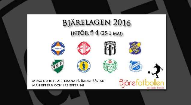 Veckans omgång för #bjärefotbollen förväntas bli tuffa matcher på många håll, det är svårt att se några säkra vinnare. Möjligen VK´s damer som ligger bäst till, sämst till har vi nog Förslöv som haft en tråkig start på säsongen och att hämta poäng nere på Råå är inte det enklaste. Annars så förväntas såklart Grevie inkassera sin första seger för säsongen, lever de upp till förväntningarna? Och var står egentligen Vejby i sin omgivning i division 3? Nu möter man ett lag som haft liknande resa som sig själv så här långt, kan man ta sin första vinst eller blir det som tros ett kryss? Glöm sedan inte att hänga på och "tune in" till Radio Båstad, uppsnacket varje fredag efter 14 och sammanfattning för den gånga helgen varje måndag efter 8. Vi lägger till ett litet 1X2 tips denna vecka för respektive match och lagets position i tabellen inom parantes (). Fjärde omgången: (HA Div.4 N) 2016-04-30 15:00 Råå IF (5) - Förslövs IF (11) = 1 (HA Div.5 NV) 2016-04-30 14:00 Jonstorps IF FK (12) - Grevie GIK (11) = 2 2016-04-30 14:00 Skäldervikens IF (7) - Båstads GoIF (10) = 2 2016-04-30 15:00 Västra Karups IF (4) - Helsingborg City FC (3) = X (DA Div.2 N) 2016-04-30 12:00 Västra Karups IF (8) - Fjälkinge IF (10) = 1 Tredje omgången: (HA Div.3 SV Götaland) 2016-04-29 19:00 Stafsinge IF (10) - Vejby IF (9) = X Andra omgången: (HA Div.7 NV) 2016-04-30 14:00 Hovs GoIF (9) - Kropps GIF (1) = X 2016-04-30 14:00 Torekovs IK (4) - Össjö IS (3) = 2 Första omgången: (DA Div.3 NV) 2016-04-30 14:00 Eskilsminne IF - Ängelholms FF/Bjärelaget DFF = 1 Bjärefotbollen på Radio Båstad #bjärefotbollen Uppsnack fredagar strax efter 14 Sammanfattning från helgens matcher varje måndag efter 8 http://www.radiobastad.se/bj%C3%A4refotbollen-28727986 (HA Div.3 SV Götaland) Vejby IF (HA Div.4 N) Förslövs IF (HA Div.5 NV) Båstads GIF Grevie GIK Västra Karups IF (HA Div.7 NV) Hovs GIF Torekovs IK (DA Div.2 N) Västra Karups IF (DA Div.3 NV)