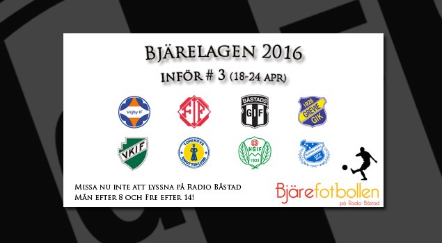 Det var en tung vecka för #bjärefotbollen då man endast lyckades skrapa ihop 2 poäng av 18 möjliga. Närmst vinst var Västra Karups herrar som fick ett mål bortdömt i slutet på sin match mot Hais. Veckans överraskning, men kanske ändå inte? skedde i #superfemman när Billesholms GIF fortsätter och vinna genom sina omställningar. Denna gång var det Åstorps FF som fick se sig besegrade med 3-1 efter bra försvarspel och kobra snabba omställningar! Glöm sedan inte att hänga på och "tune in" till Radio Båstad, sammanfattning för den gånga helgen varje måndag efter 8 och uppsnacket varje fredag efter 14. Andra omgången: (HA Div.4 N) 2016-04-16 15:00 Ekets GoIF - Förslövs IF 2-0 (0-0) Eket: Jesper Persson 2 I en spelmässigt jämn match, utan något skönspel (fortfarande tidigt på säsongen så planen hjälper inte till), var det hemmalaget som bättre tog vara på de chanser som dök upp.. - Förslövs IF (HA Div.5 NV) 2016-04-15 19:00 Brunnby FF - Båstads GIF 5-3 (3-1) Brunnby: Jovan Babovic 3, Ludvig Hjalmarsson, Tobias Gilje, Båstad: Arsim Tetaj, Otto Carlsson, Viktor Hägerström Vi är för naiva i vårt försvarsspel, säger Båstad-tränaren Jonas Dock. I dag ger vi bort två-tre mål 2016-04-16 14:00 Västra Karups IF - Helsingborgs AIS 2-2 (1-2) VKIF: Anton Jarl, Magnus Lindqvist, HAIS: Peter Lindström, Joel Hellberg Ett sent bortdömt mål för VK. -Det var en jäkla röra innan allt var klart. Först godkände de målet, sen dömde de bort det för offside. - Västra Karup IF 2016-04-17 14:00 Skäldervikens IF - Grevie GIK 2-0 (1-0) Skälderviken: Nicklas Sandgren, Markus Larsson På en regntung plan var det hemmalaget Skälderviken som drog det längst strået och kunde kamma hem 3 pinnar efter 2-0 - Grevie GIK (DA Div.2 N) 2016-04-16 14:00 IFÖ/Bromölla - Västra Karups IF 2-0 (2-0) IFÖ/Bromölla: Ellinore Kieninger 2 Vår längsta resa och kanske en av de tuffaste matcherna för säsongen, seriefavoriten Bromölla på bortaplan. - Västra Karup IF Första omgången: (HA Div.3 SV Götaland) 2016-04-15 15:00 Klippans Förenade FF - Vejby IF 3-3 (1-1) Klippan: Jesper Nilsson, självmål, Carl Månsson, Vejby: Andreas Möller, Mario Gadza, Stephan Olsson En typisk premiärmatch med många felpass, nervöst, tung knutig plan men en härlig inställning och vi gav aldrig upp. - Vejby IF (HA Div.7 NV) 2016-04-23 15:00 Össjö IS - Hovs GoIF 2016-04-24 14:00 IK Bergandy - Torekovs IK (DA Div.3 NV) 2016-04-30 14:00 Eskilsminne IF - Ängelholms FF/Bjärelaget DFF Bjärefotbollen på Radio Båstad #bjärefotbollen Uppsnack fredagar strax efter 14 Sammanfattning från helgens matcher varje måndag efter 8 http://www.radiobastad.se/bj%C3%A4refotbollen-28727986 (HA Div.3 SV Götaland) Vejby IF (HA Div.4 N) Förslövs IF (HA Div.5 NV) Båstads GIF Grevie GIK Västra Karups IF (HA Div.7 NV) Hovs GIF Torekovs IK (DA Div.2 N) Västra Karups IF (DA Div.3 NV) Bjärelaget DFF