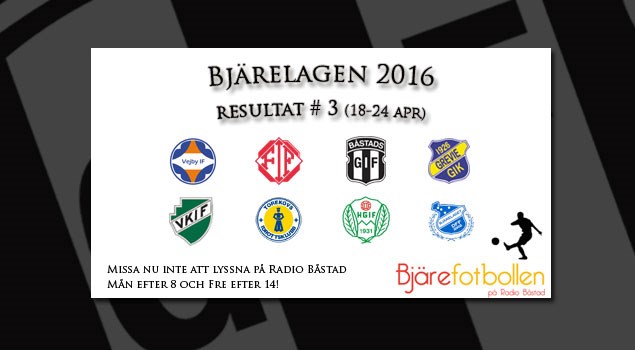 Det var ingen större helg för bjärelagen då endast ett lag gick vinnande ur sin kamp, denna gång var det Båstad som lyckades ta med sig samtliga poäng i mötet med Perstorp Bälinge IK. Man vann matchen med 4-0 och fick äntligen visa upp sig från en bättre sida. Annars var det dåligt med poäng för bjärefotbollen, VK och Grevie delade broderligt på vars en pinne. Tillsammans med Torekov som känner att det troligtvis förlorade 2 pinnar istället för att vinna en. Glöm sedan inte att hänga på och "tune in" till Radio Båstad, sammanfattning för den gånga helgen varje måndag efter 8 och uppsnacket varje fredag efter 14. Vi lägger till lagets position i tabellen inom parantes (). Tredje omgången: (HA Div.4 N) 2016-04-23 14:00 Förslövs IF (11) - Vinslövs IF (1) = 1-5 Förslöv: Melker Lindqvist, Vinslöv: Självmål 2, Fredrik Borggren, Christoffer Ekelund, Christian Jochmus-Stöcke Förslöv fick göra säsongens första mål, men tyvärr så gör man också två i eget mål och slutresultatet skrivs till 1-5 (HA Div.5 NV) 2016-04-22 18:30 Västra Karups IF (4) - Grevie GIK (11) = 1-1 VK: Per Lindström, Grevie: Filip Bengtsson Rapporterna säger att VK var det bättre laget, men att de trots detta skulle kunnat bli helt utan poäng då man i slutet på matchen släpper till en riktigt het chans som Grevie inte lyckas förvalta. 2016-04-24 14:00 Båstads GoIF (10) - Perstorp Bälinge IK (9) = 4-0 Båstad: Otto Carlsson, Självmål, Arsim Tetaj, William Taher - Men vi hade ett bra försvarsspel matchen igenom, säger Dock. Och nu fick vi ju visa att vi kan framåt också. (DA Div.2 N) 2016-04-23 13:00 Broby IF (6) - Västra Karups IF (8) = 2-0 Broby: Sandra Malm, Zinett Fritzson En ny borta förlust mot för VK´s damer, man hade svårt att komma in i matchen och fick inte sitt spel att stämma enligt egna tränaren. Andra omgången: (HA Div.3 SV Götaland) 2016-04-23 15:00 Vejby IF (9) - Kågeröds BoIF (2) = 1-3 Vejby: självmål, Kågeröd: Niklas Nielsen 2, Andreas Lundblad Nicklas Nielsen fortsätter att visa vägen för Kågeröd och gör skillnad denna dag med sina två mål. Första omgången: (HA Div.7 NV) 2016-04-23 15:00 Össjö IS (3) - Hovs GoIF (9) = 1-0 Össjö: Behar Popova Össjö vann efter frispark och såg sig som det bättre laget i denna kamp. 2016-04-24 14:00 IK Bergandy (5) - Torekovs IK (4) = 2-2 Bergandy: Mahmoud Abu Hawash, Othman Bachri, Torekov: Elof Söderman, Rudolf Bengtsson En besviken Torekovs tränare efter tappet 0-2 till 2-2. -Vi skapade så mycket att vi ska vinna det här, säger han. (DA Div.3 NV) 2016-04-30 14:00 Eskilsminne IF - Ängelholms FF/Bjärelaget DFF = 1 Bjärefotbollen på Radio Båstad #bjärefotbollen Uppsnack fredagar strax efter 14 Sammanfattning från helgens matcher varje måndag efter 8 http://www.radiobastad.se/bj%C3%A4refotbollen-28727986 (HA Div.3 SV Götaland) Vejby IF (HA Div.4 N) Förslövs IF (HA Div.5 NV) Båstads GIF Grevie GIK Västra Karups IF (HA Div.7 NV) Hovs GIF Torekovs IK (DA Div.2 N) Västra Karups IF (DA Div.3 NV) Bjärelaget DFF
