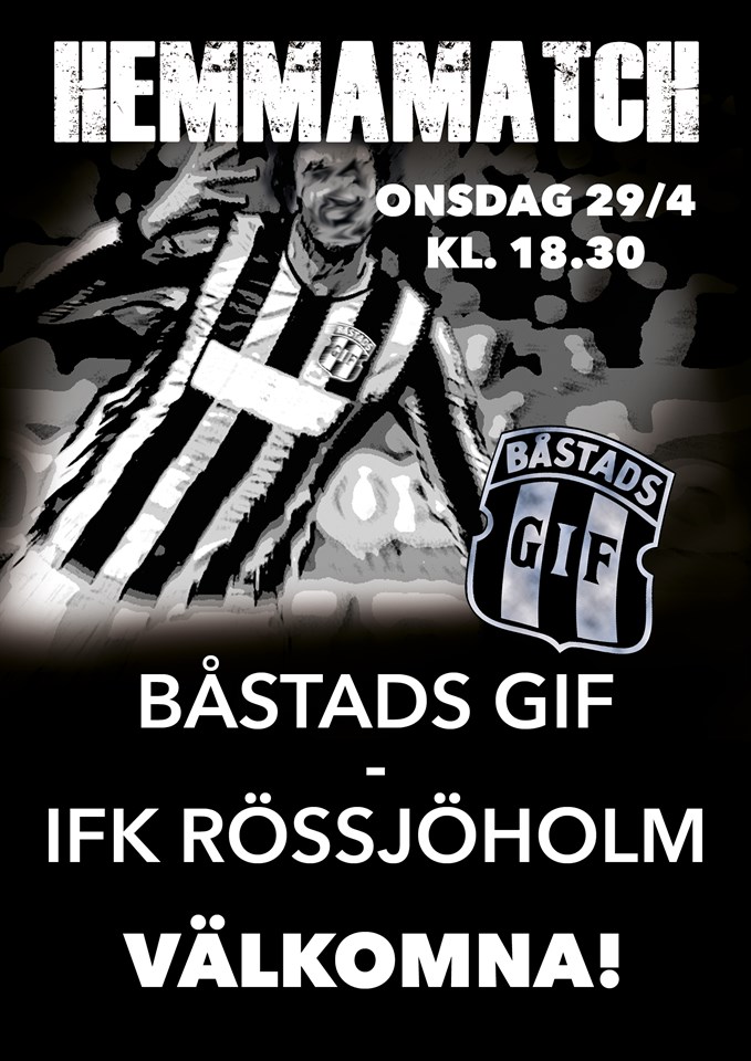 I morgon onsdag 29/4 klockan 18.30 är det dags igen. Båstads GIF spela hemmamatch mot IFK Rössjöholm. Det kommer bli en tuff tillställning. Kom och stötta Giffen A-lag! Vi ses på Örebäcksvallen!