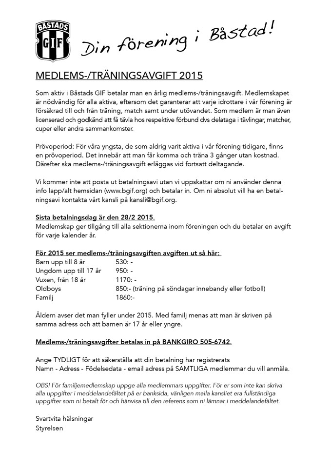 God fortsättning alla Giffare! Det är nu nytt år och dags att betala medlems-/träningsavgift för 2015. Sista betalningsdag är 28/2, hur ni betalar samt 2015 års priser finner ni i det bifogade dokumentet. Som aktiv i Båstads GIF betalar man en årlig medlems-/träningsavgift. Medlemskapet är nödvändig för alla aktiva, eftersom det garanterar att varje idrottare i vår förening är försäkrad till och från träning, match samt under utövandet. Som medlem är man även licenserad och godkänd att få tävla hos respektive förbund dvs deltaga i tävlingar, matcher, cuper eller andra sammankomster. Medlemskap ger tillgång till alla sektionerna inom föreningen och du betalar en avgift för varje kalender år. Svart vita hälsningar Styrelsen
