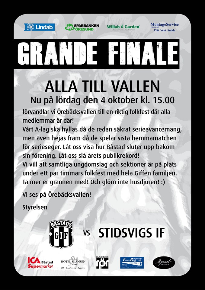Nu på lördag den 4 oktober kl. 15.00 förvandlar vi Örebäcksvallen till en riktig folkfest där alla medlemmar är där! Vårt A-lag ska hyllas då de redan säkrat serieavancemang, men även hejas fram då de spelar sista hemmamatchen för serieseger. Låt oss visa hur Båstad sluter upp bakom sin förening. Låt oss slå årets publikrekord! Vi vill att samtliga ungdomslag och sektioner är på plats under ett par timmars folkfest med hela Giffen familjen. Ta mer er grannen med! Och glöm inte husdjuren! :) Vi ses på Örebäcksvallen! Styrelsen